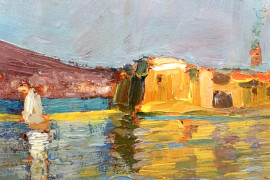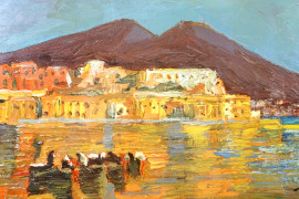 Veduta del Golfo di Napoli con pescatori, XX secolo, olio su cartone, cm 29x41, entro cornice