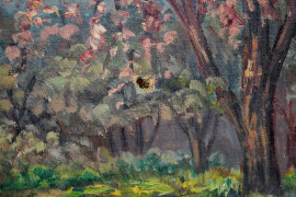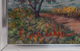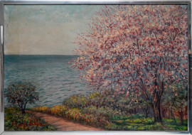 Veduta marina con albero fiorito, XX secolo, olio su tela, firmato in basso a sinistra, cm 40x56, entro cornice (difetti)
