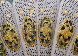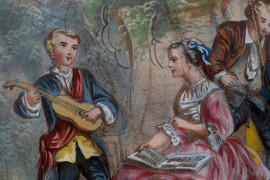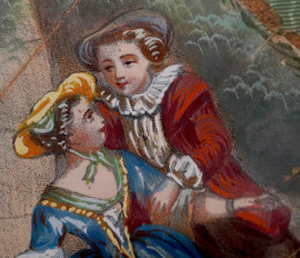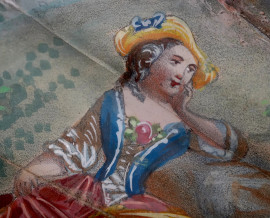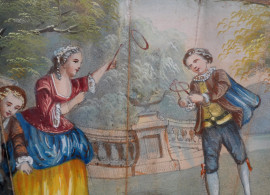 Ventaglio in carta dipinto al verso e al recto con scene galanti e ludiche, bordo dorato, XIX secolo, cm 26,5x49, entro cornice a bacheca, (difetti)