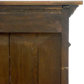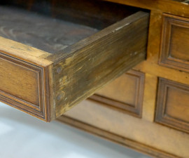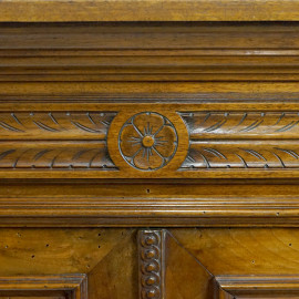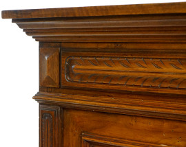 Vetrina in noce intagliato, due sportelli contenti interno a tre scaffali, doppia coppia di cassetti nella parte inferiore, XX secolo, cm 143x116x35,5, (difetti)