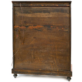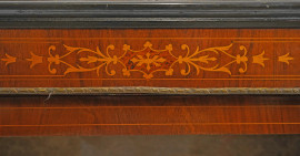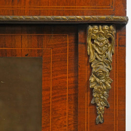 Vetrinetta a tre ripiani in legno con decori intarsiati e rifiniture in metallo brunito, poggiante su 4 piedini torniti, XIX-XX secolo, cm 103x76x28 (difetti)