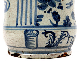 Albarello in ceramica bianca e blu, con decorazioni floreali, figure di volatili e libellule, fine XVII secolo, altezza cm 18 (difetti)