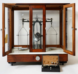 Bilancia di precisione in materiali vari, XX secolo, cm 51x50x26 (difetti e rotture)