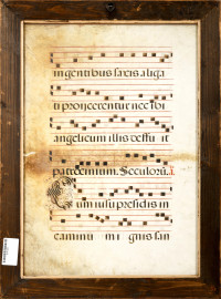 'Cantorum…', inchiostro su pergamena, recto e verso, cm 54x37, entro cornice, (difetti)