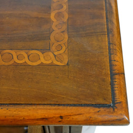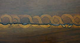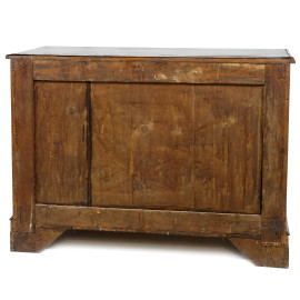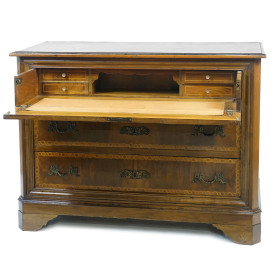 Cassettiera in noce a tre cassetti con decori intarsiati in varie essenze, inserti in metallo dorato, XIX secolo, cm 87,5x118x50,5, (difetti, parti sostituite e restauri)