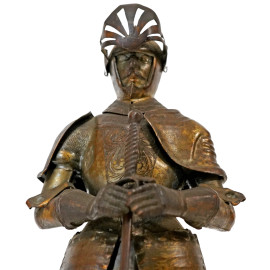 Cavaliere in armatura, XX secolo, metallo su base lignea, altezza cm 24,5, (difetti)
