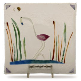Centro tavola quadrangolare in vetro con decorazione policroma a rilievo raffigurante fenicottero, XX secolo, cm 21,5x21,5