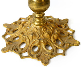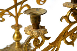 Coppia di candelabri a cinque luci in bronzo dorato lavorato a foggia di racemi, inizio XX secolo, misure massime cm 44,5x54x18, (difetti)