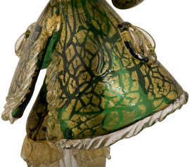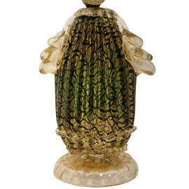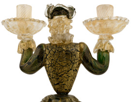 Coppia di candelabri a foggia di figure veneziane in vetro di murano trasparente, verde e nero con inclusioni dorate, XX secolo, altezza cm 48 (difetti e rotture)