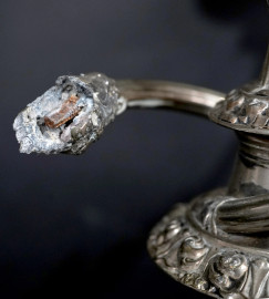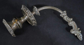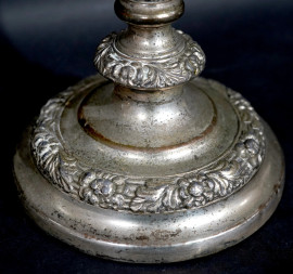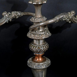 Coppia di candelabri a tre fuochi in metallo argentato cesellato a motivi fitomorfi, inizio XX secolo, altezza cm 49,5 (difetti e rotture)