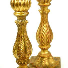 Coppia di candelieri in legno intagliato e dorato, XX secolo, altezza cm 20 (difetti)