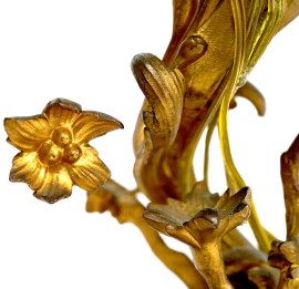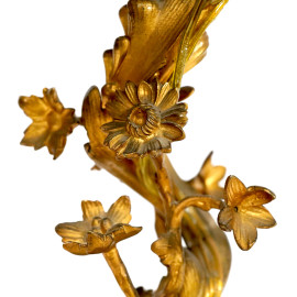 Coppia di candelieri montati a lume a quattro luci in bronzo dorato e cesellato con decorazioni fitomorfe e floreali, XX secolo, altezza cm 51, (difetti)