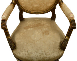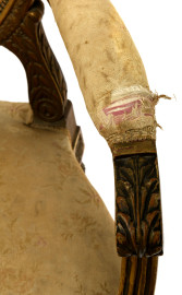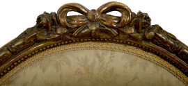 Coppia di poltroncine in legno dorato e intagliato con rivestimento in tessuto a decori floreali, XIX secolo, cm 106x64,5x57, (difetti)