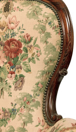 Coppia di poltrone in legno intagliato con seduta e schienale imbottiti, XX secolo, cm 112,5x52x50 circa