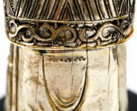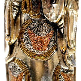 Coppia di sculture placcate in argento rappresentanti un imperatore e un'imperatrice cinesi, XX secolo, base circolare in legno, altezza max cm 30,5