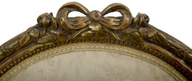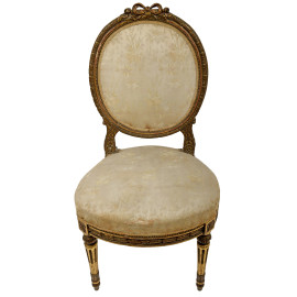 Coppia di sedie in legno dorato e intagliato con rivestimento in tessuto a decori floreali, XIX secolo, cm 99x51,5x47, (difetti)