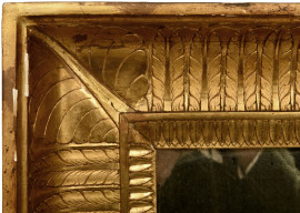 Cornice impero in legno dorato intagliato "a foglie" con specchio, ingombro cm 86x72,5, luce cm 66x52,5, (difetti)