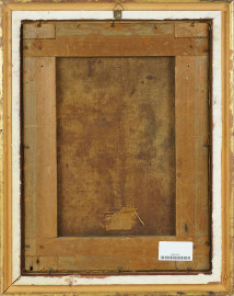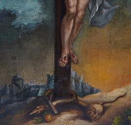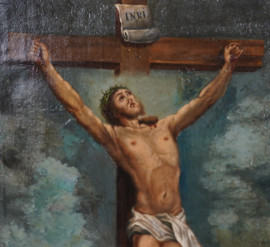 Crocifissione, olio su tela, XIX secolo, cm 42x31, entro cornice, (difetti)