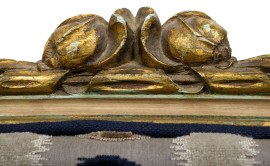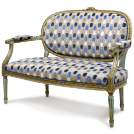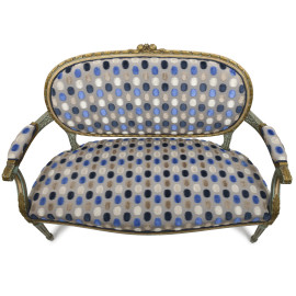 Divanetto in legno laccato e intagliato, con rivestimento in stoffa policroma a pois, XIX-XX secolo, cm 86x116x51, (difetti)
