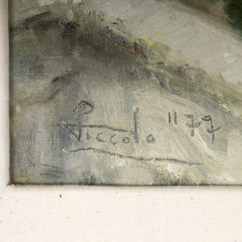 Ettore Piccolo, In periferia, olio su compensato, cm 60x50, firmato e datato "77" in basso a sinistra, titolato sul retro, entro cornice