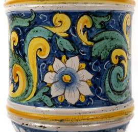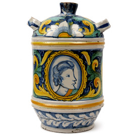 Fiasca in ceramica nei toni del bianco, blu, verde e giallo, con decori vegetali e un profilo maschile, XIX secolo, altezza cm 27 (difetti)