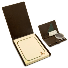 Gucci vintage, lotto composto da una custodia in pelle contenente una lente di ingrandimento e un tagliacarte portatili e un blocco notes, misura max cm 22x15,5 (entro scatole originali)