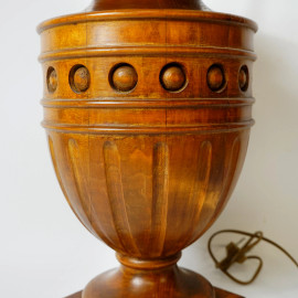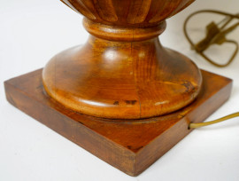 Lampada a due luci con corpo in legno intagliato a foggia di urna su base quadrata, altezza cm 84, XX secolo, (difetti)