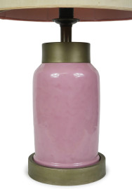 Lampada in ceramica smaltata rosa e metallo, base circolare, altezza cm 46,5 (misure comprese paralume in stoffa cm 76)