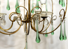 Lampadario con struttura in bronzo dorato a quattro luci, con pendenti in vetro trasparente e verde, XX secolo, cm 96x46 ca, (difetti)