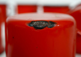 Lotto composto da 12 tazze in metallo smaltato rosso e nero, manifattura polacca, XX secolo, altezza cm 7,5, (difetti)