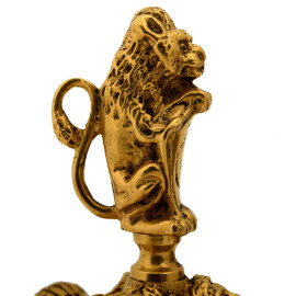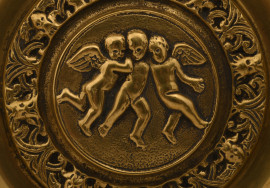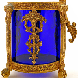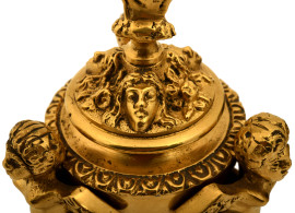 un piatto in bronzo dorato decorato a bassorilievo con tre putti al centro, tesa a grottesche con mascheroni, volute e putti; una tazza in metallo dorato e vetro blu, decori cesellati di gusto Impero; un piccolo cestino in metallo dorato e vetro con decori cesellati; un calamaio in metallo dorato riccamente decorato con tre arpie, coperchio con mascheroni e presa a foggia di leone, misura max cm 16x10