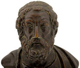 Lotto composto da due sculture in bronzo raffiguranti il busto di Platone e di Aristotele, piedistallo circolare in marmo, altezza max cm 18 compreso il piedistallo