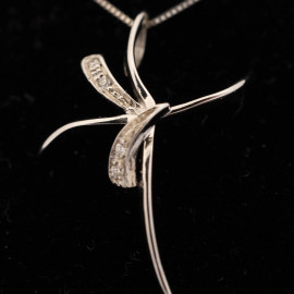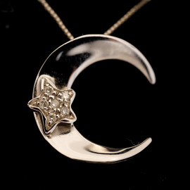 Lotto composto da una catenina in oro bianco con ciondolo con zirconi, una catenina in oro bianco con ciondolo a forma di mezza luna con brillantini, una collanina in oro giallo 18 Kt con ciondolo a forma di croce e un paio di orecchini in oro giallo 18 Kt, peso gr. 8