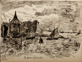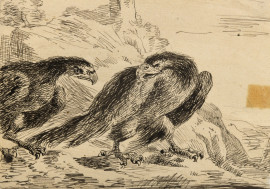 a) Aquile, china su carta, XX secolo; b) Marina con imbarcazioni, china su carta, XX secolo; c) Pastore con armenti, china su carta, XX secolo, misura max cm 12,4x17