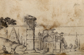 a) Capriccio con figure, china su carta filigranata, XIX secolo; b) Veduta del Colosseo, china su carta filigranata, XIX secolo; c) Arco di Trionfo, china acquarellata su carta, XIX secolo, misura max cm 16x24,7 (difetti)