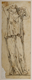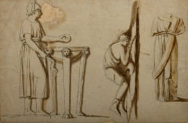 a) Figura femminile, china e acquarello su carta, XVIII-XIX secolo; b) Figura femminile con orcio, china e matita su carta, XVIII-XIX secolo; Studio, china acquarellata su carta incollata su carta, XVIII-XIX secolo; Studio di sculture, matita su carta, XIX-XX secolo; Figura femminile di spalle, matita e penna dorata su carta, XX secolo, misura max cm 23,5x35,5 (difetti)