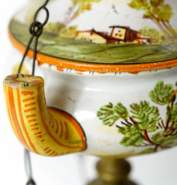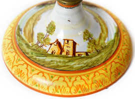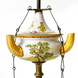 Lume ad olio in ottone e ceramica decorata in policromia con paesaggio campestre, XX secolo, cm 69, (difetti)