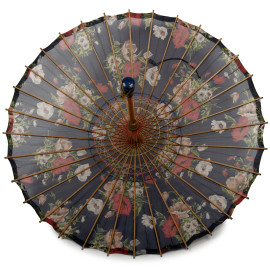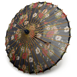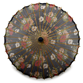 Ombrellino parasole in bambù e stoffa a motivi floreali, XX secolo, lunghezza cm 51, (difetti)