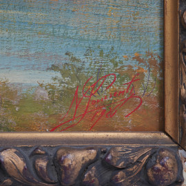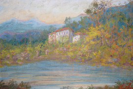 Paesaggio fluviale, olio su cartone, firmato, cm 33x48, entro cornice