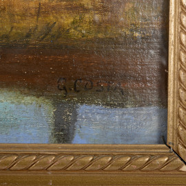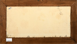 Paesaggio lacustre, olio su tela incollata su cartoncino, cm 30x63, entro cornice
