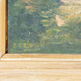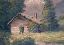 Paesaggio montano con baita, XX secolo, olio su cartone, cm 20x29,7, entro cornice