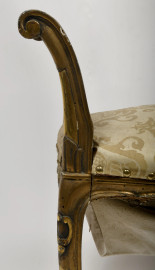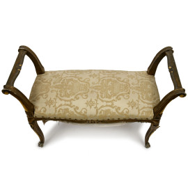 Panchetta dorata e intagliata rivestita in tessuto panna-oro, XX secolo, cm 59x88x35, (difetti)