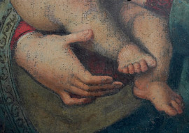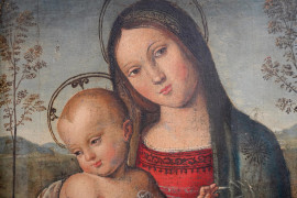 Pittore del XIX secolo, Madonna con il Bambino entro un paesaggio, olio su tavola, cm 42,5x28,3, entro cornice