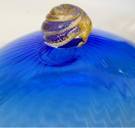 Porta bon bon in vetro blu con decori intagliati a spicchio, presa dorata spiraliforme, XX secolo, altezza cm 24