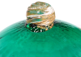 Porta bon bon in vetro verde con decori intagliati a spicchio, presa dorata spiraliforme, XX secolo, altezza cm 25