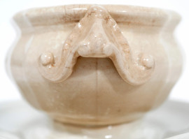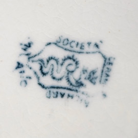 Salsiera in ceramica con stemma a stampa blu, XX secolo, cm 8,5x20x14, (difetti)