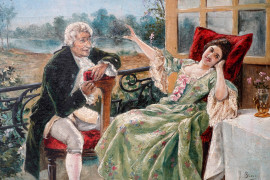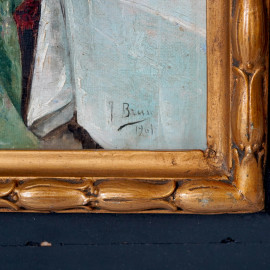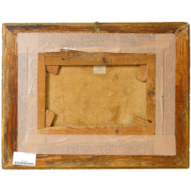 Scena di corteggiamento, olio su tela, firmato, cm 34x24, entro cornice, (difetti)