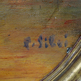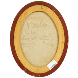 Scorcio di paese, olio su tela in assetto ovale, XX secolo, firmato in basso a destra, cm 40x30, entro cornice