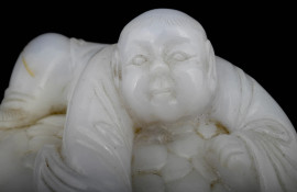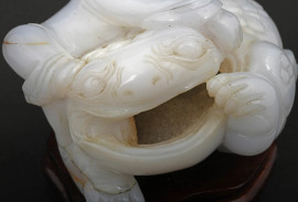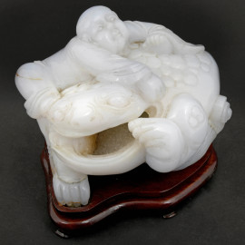 Scultura in giadeite raffigurante Buddha con un rospo, base in legno, XX secolo, cm 12x13,5x13 circa