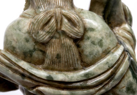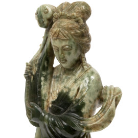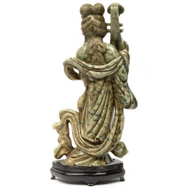 Scultura in pietra saponaria raffigurante una Guanyin con strumento musicale, base in legno, XX secolo, altezza cm 36